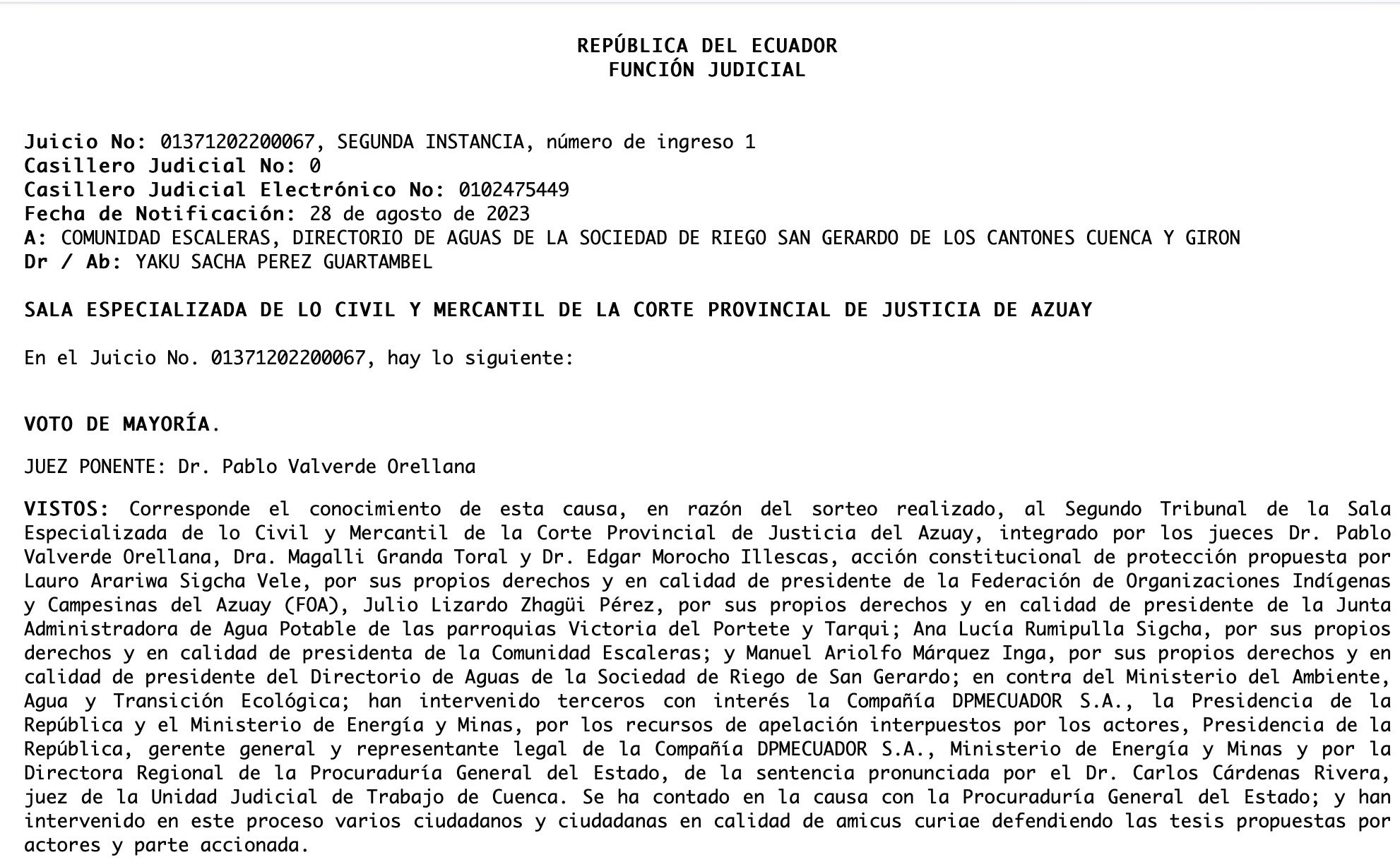 El activista agradeció a los defensores del agua de Tarqui, Victoria del Portete, Giron, Santa Isabel, San Fernando, Cuenca, quienes meses atrás presentaron la acción de protección. “Un histórico precedente judicial en materia de los Derechos del Agua y la Madre Naturaleza”, recalcó Pérez en su posteo.