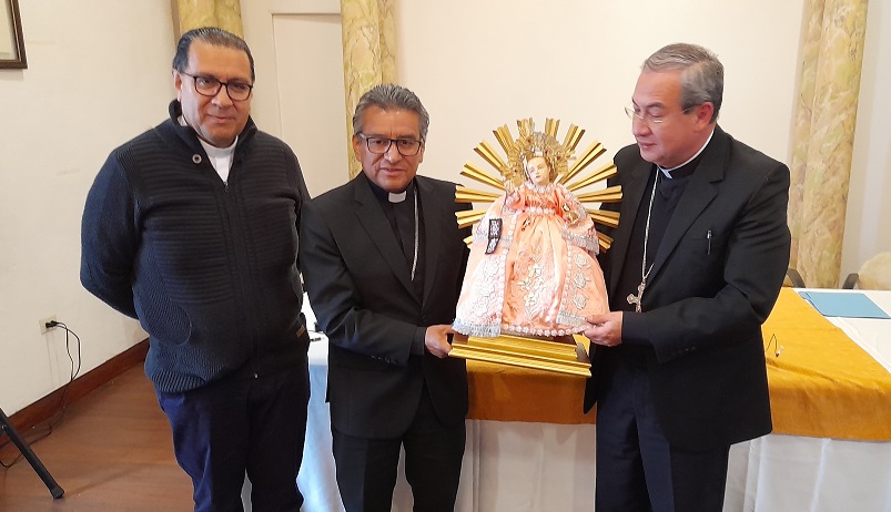 Miembros del clero de Cuenca sostienen la imagen del Niño Viajero.