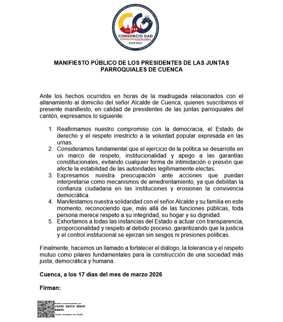 Frente a lo que desde varios sectores ciudadanos de Cuenca se considera una abierta persecución al alcalde de Cuenca, Cristian Zamora, por parte del gobierno del presidente neoliberal Daniel Noboa, mediante la utilización de los organismos judiciales y de control, los Gobiernos Autónomos Descentralizados de Cuenca expresan su firme respaldo a la primera autoridad de la ciudad.