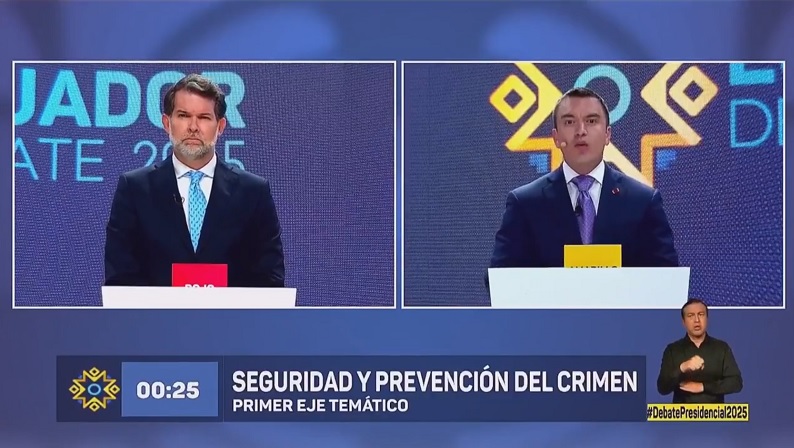 Tras pronunciar esas palabras, Noboa lanzó inmediatamente un ataque contra Tabacchi, recordándole que cuando era gobernador de la provincia de Guayas «fue la época más violenta de la historia» de esa provincia, mientras que bajo su mandato la situación «ha mejorado un 22 %».