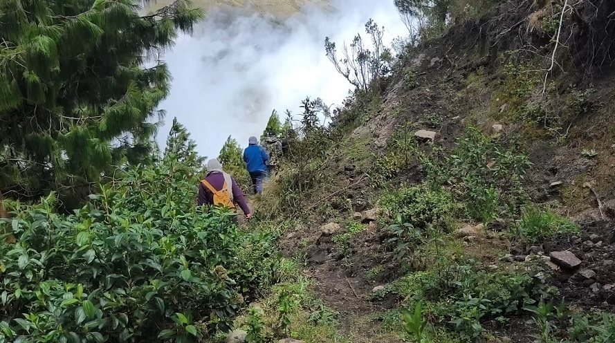 Con el viento azotando muy fuerte contra la humanidad de los caminantes, la caravana se abre paso sobre el trazado de un antiguo sendero en las alturas de Migüir, Molleturo, observando la imponente geografía que se extiende entre la bruma hasta desbarrancarse hacia las planicies de El Empalme, Naranjal, Puerto Inca.